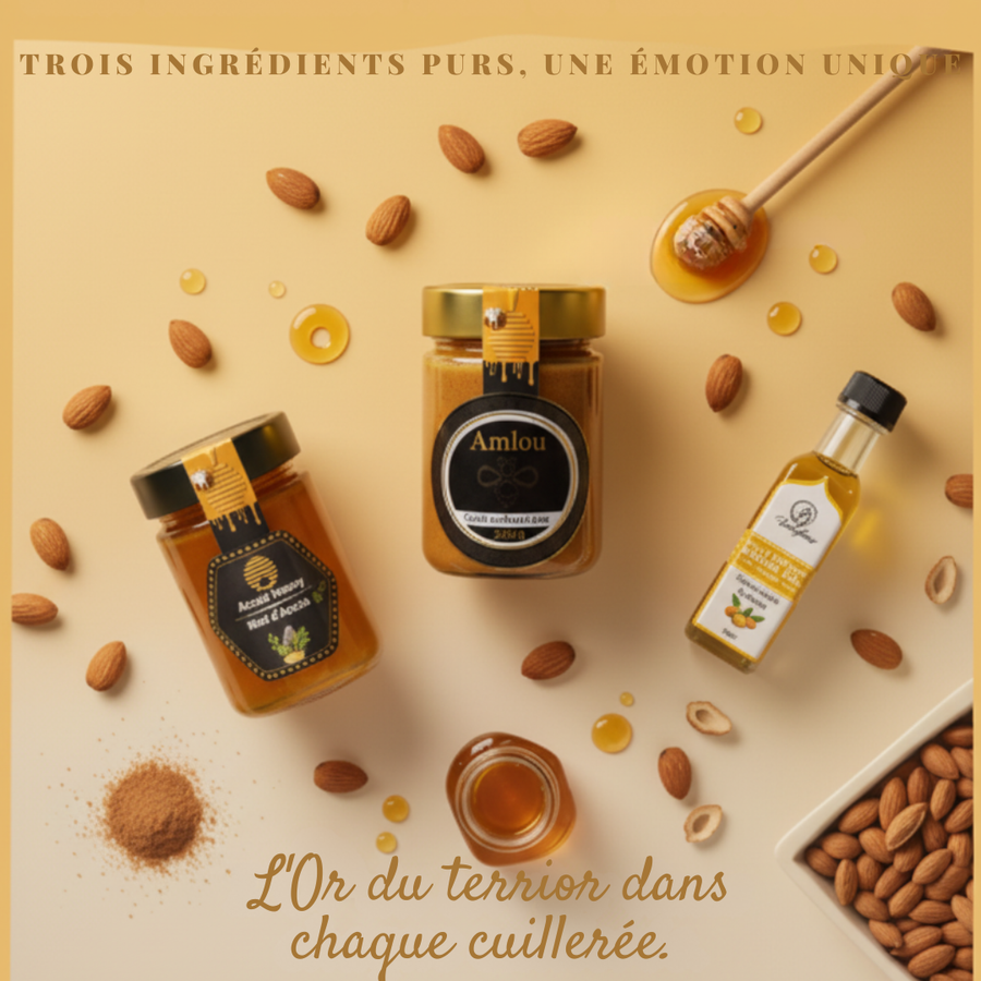 les amandes torrĂ©fiĂ©es pour leur chaleur, le miel pur pour sa douceur sincĂšre,lâhuile dâargan artisanale pour sa noblesse intemporelle.